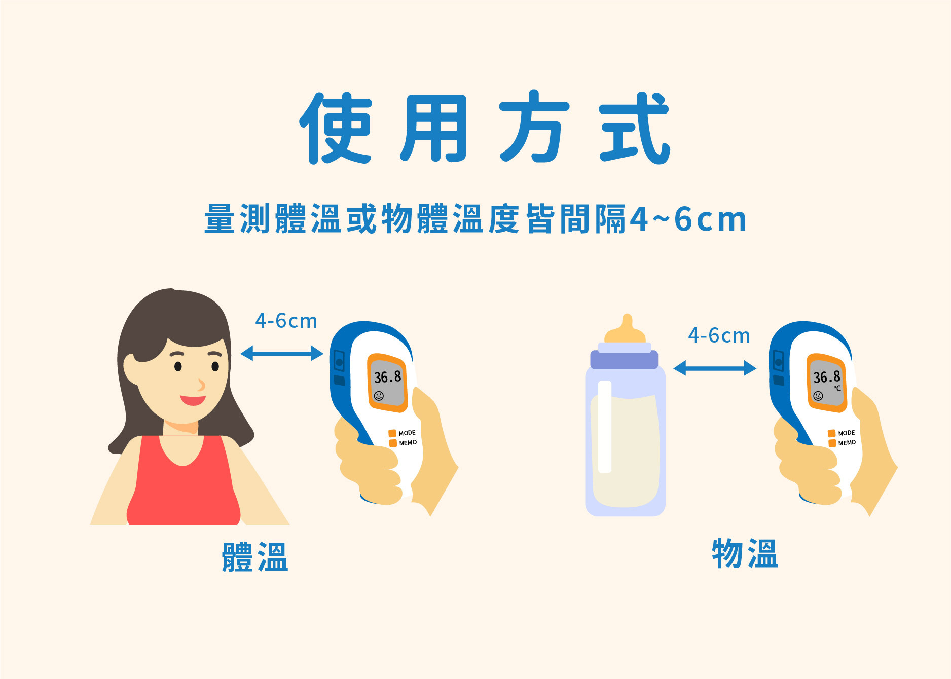 將額溫槍對準額頭,保持 4–6 公分距離,按下測溫鍵。