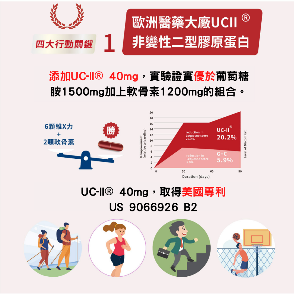 領固力® 採用國際認證的 UC-II® 非變性二型膠原蛋白,與一般膠原蛋白相比,僅需每日小劑量補充,即可作為日常靈活度營養的核心來源。