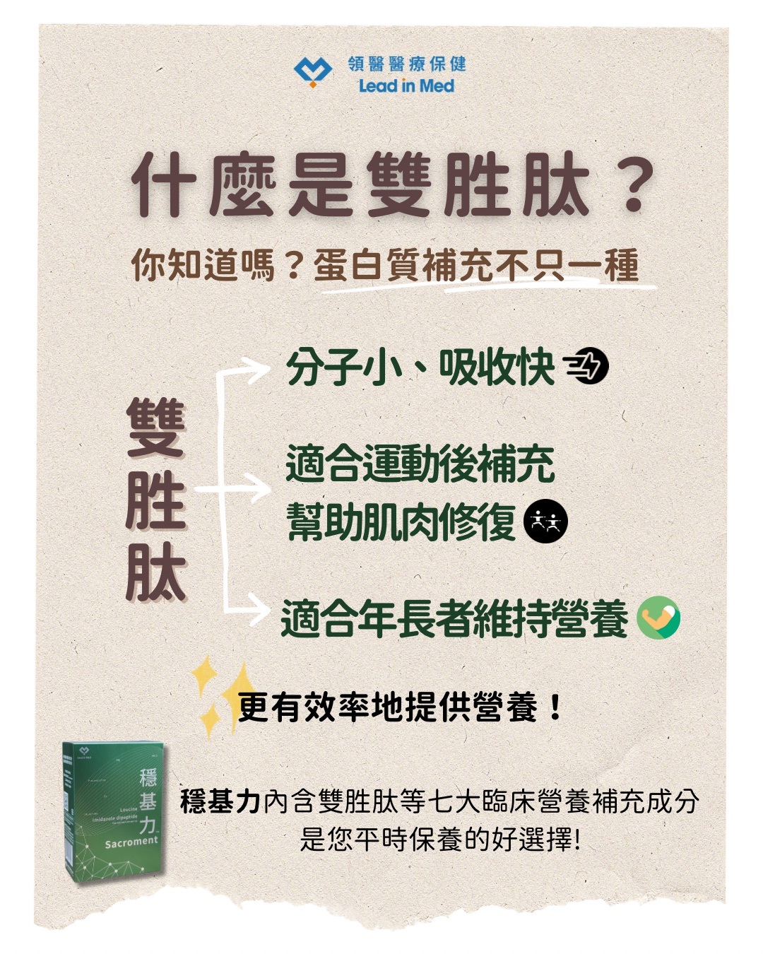 A:它比傳統蛋白粉更進一步,補的是吸收效率高的雙胜肽與多元營養,幫助肌耐力、恢復力與代謝穩定。