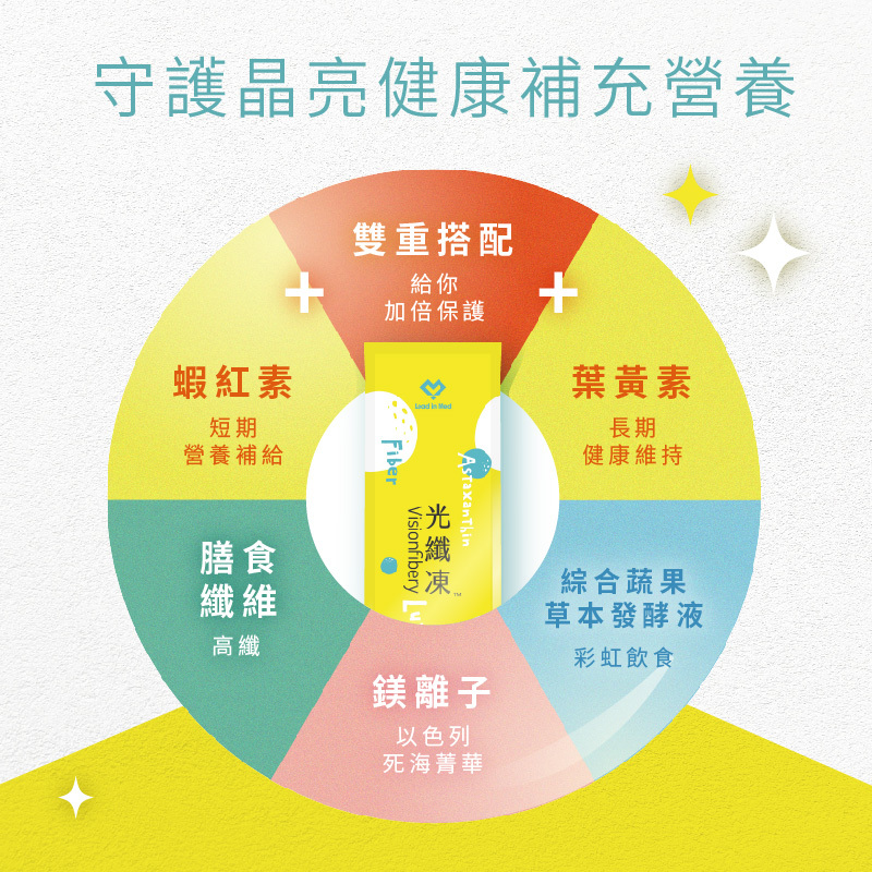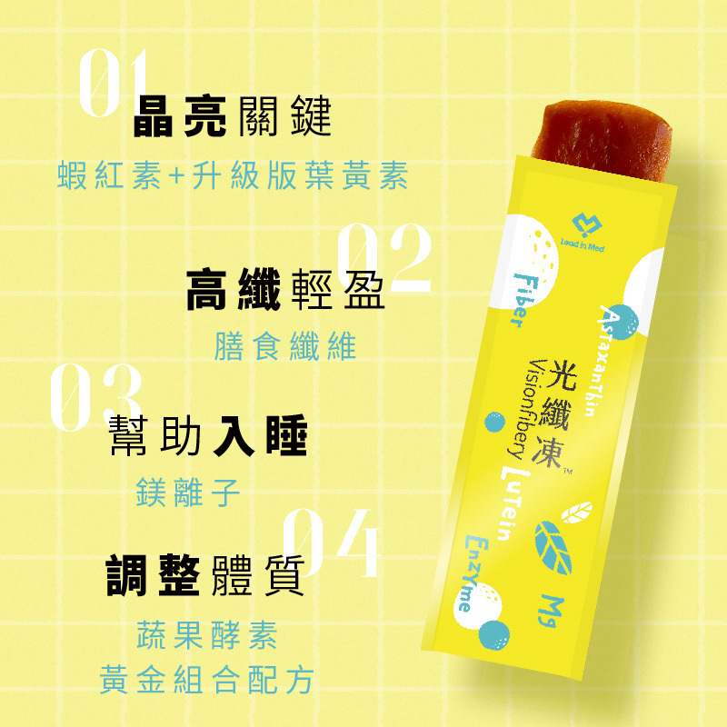 光纖凍® Visionfibery 是一款針對長時間使用 3C 族群設計的每日營養果凍,每包含有來自日本的專利葉黃素配方,高纖低糖、不含脂肪、鈉含量低,適合各年齡層日常保養,是你守護活力與專注的輕鬆選擇。